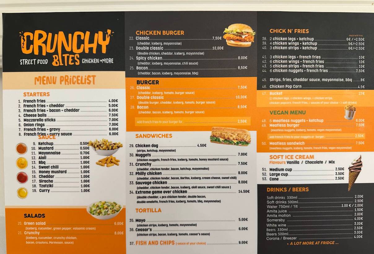 Για όσους αναζητούν γεύσεις στο χέρι, το street food στην Ίο αποκτά νέα διάσταση. Με έμφαση στο ποιοτικό fast food, το μενού προσφέρει πλούσιες επιλογές που κερδίζουν κάθε ουρανίσκο. Από φρεσκοφτιαγμένα σαντουϊτς και γεμάτες γεύση τορτίγιες, μέχρι τραγανό τηγανητό κοτόπουλο σε απολαυστικό bucket, οι προτάσεις είναι αμέτρητες. Οι λάτρεις του κοτόπουλου θα λατρέψουν τις χρυσαφένιες κοτομπουκιές, τις ζουμερές φτερούγες ή τα τραγανά chicken strips, ενώ οι φίλοι των θαλασσινών μπορούν να απολαύσουν το κλασικό fish and chips. Ιδανικό για γρήγορο γεύμα, παρέες ή βραδινές λιγούρες, πάντα με εύκολη επιλογή take away, το Crunchy Bites Street Food φέρνει τον κόσμο του street flavor στο νησί.